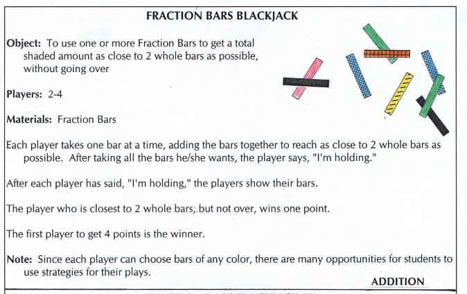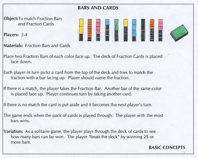 | Many of the published games which were designed for fraction bars were changed by the students so that they could be played with both the bars and cards. The next game is described with fraction bars, and the students' version shows how fraction playing cards were brought into the game.** | |||||||||||||||||||||||||||