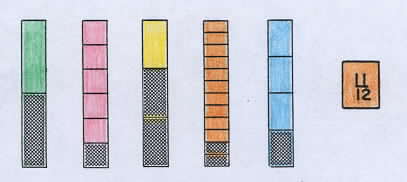 | The game continues until all the bars have been won or no more plays are possible. At one time Alexandra had these bars, and turned over a playing card with 11/12. She won two bars by combining the 2/3 bar and the 1/4 bar to get 11/12. How could she have won three bars? | |||||||||||||||||||||||||||