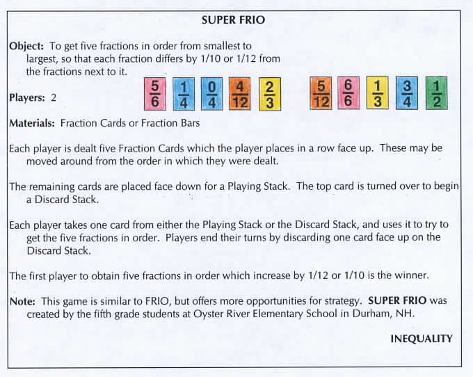 **FRIO was first described by Rowenda Drizigacker, Arithmetic Teacher, Vol. 6, No. 4, December 1966, 436-37. "Fraction Games - Visions and Revisions" was published in Teaching Mathematics: Strategies That Work, edited by Mark Driscoll and Jere Confrey, 1985. It is printed here by permission of the Northeast Regional Exchange. |