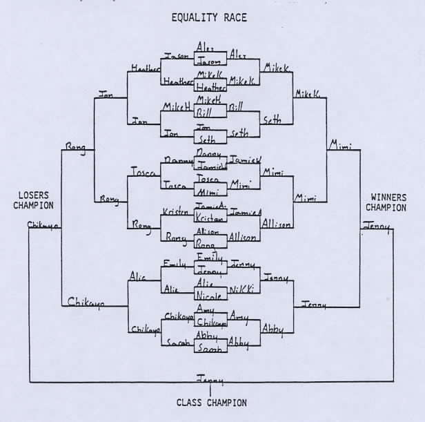 | Several students organized tournaments for some of the games. Alex and Billy set up a tournament for Number Line Racing. The Equality Race tournament which is shown below was organized and managed by Jon. In all the tournaments there was a winner's champion and loser's champion, and they competed for the class championship. | |||||||||||||||||||||||||||