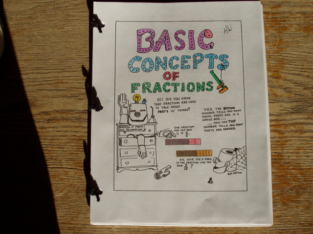 The eight major sections of the Grades 5-8 Teacher Resource Package have an average of 13 worksheets each. The top of many worksheets have an explanation or example that connects to the Fraction Bars model from the games and activities in the Teacher's Guide. Each of the eight section begins with a full-page cartoon and students sometimes use these as the cover of a booklet containing the worksheets from a given section (see photo below). At the end of each section there are two pages of word problems for the given topic. A sample worksheet has been selected for each of the following topics: Basic Concepts; Equality; Inequality Addition; Subtraction; Multiplication; Division; and Fractions-Decimals-Percents. |