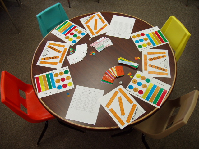 and a die. The table for each group of four teachers might look similar to the one shown in the following photo. |