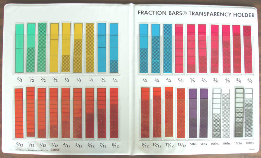 | (5) There are 49 colored Fraction Bars Transparencies. There is a transparency corresponding to each plastic Fraction Bar. The transparencies can be used for teacher or student demonstrations of fraction equalities, inequalities, and the four basic operations on fractions. For organizing the transparencies for classroom demonstrations and storage there is a Fraction Bars Transparency Holder. |