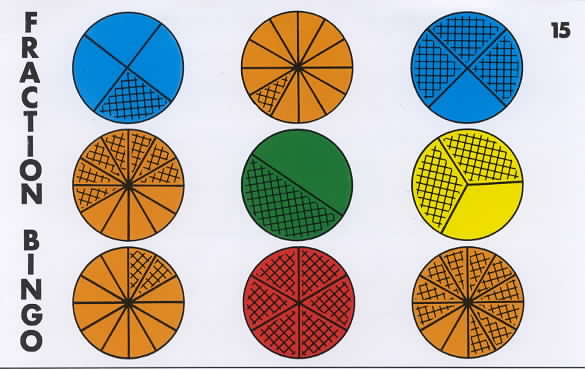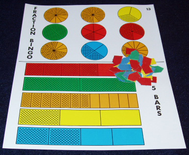 | After someone wins the game, you may want to ask them to describe each of their five bars as you check the equivalent ones that were selected for the game. Discuss the major concepts involved in this game, which are equality and the part-to-whole concept of a fraction. Ask the players to make some observations regarding the bars on their mats. Here are some possible comments: the bars can be used to show equalities, such as, a bar with 1 shaded part out of 3 is equal to a bar with 2 shaded parts out of 6, or a bar with 4 shaded parts out of 12. Discuss the Fraction Bingo game on the mat and illustrate this game by selecting a yellow transparent bar with 2 parts shaded. Anyone having a yellow disc with two parts shaded or any other disc with the same amount of shading can place a marker on their disc. Discuss the fact that it is not as easy to compare the shaded amounts of the wedged shaped parts of two discs as it is to compare the shaded parts of two bars, and that when playing Fraction Bingo, it is helpful to use the five bars at the bottom of the mat to determine equalities. Play this game by selecting transparent bars at the overhead and having players place markers on their discs. The first player to obtain three markers in a row, column or diagonal wins. |