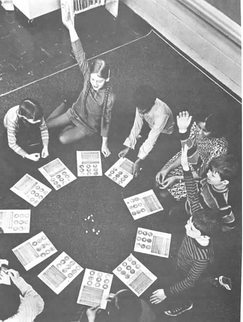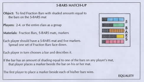 | This group of students is playing 5-Bars and the teacher has just asked a question such as, "Does anyone have a bar with 3 out of 4 parts shaded or another bar with the same shaded amount?" | |||||||||||||||||