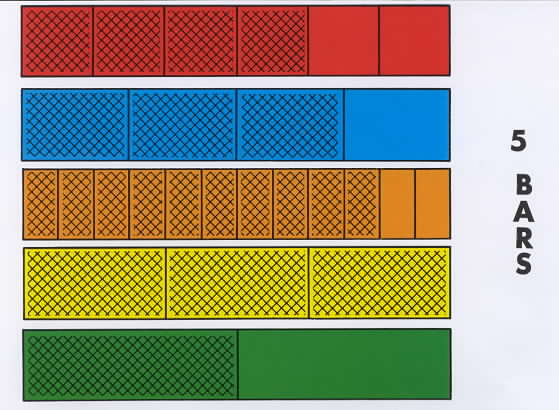| Place a transparent 5-Bars mat on the overhead to illustrate 5-Bars Match-Up and cover the Fraction Bingo discs on the upper half with a sheet of paper. Each player should have one of these mats and some markers. Select an arbitrary transparent bar and place it on the overhead to illustrate the first play of the game. Any player having a bar on their mat with the same shaded amount can place a marker off to the side of the bar. The first player to get a marker beside each of their 5 bars wins the game. | |||||||||||||||||