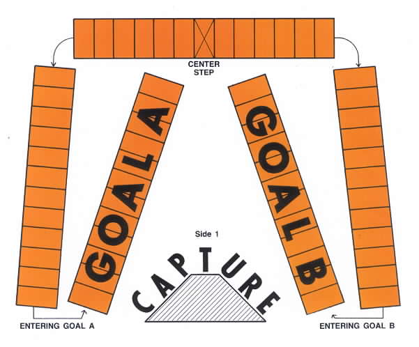 Illustrate the game Capture by placing a transparency of the mat below on the overhead and placing one marker on the Center Step. Place a 1/3 yellow bar and a 1/2 green bar on the overhead and note that Player A and Player B have chosen these bars.