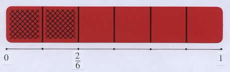 | Place a transparent bar for 2/6 on the overhead and note that the rectangular shape of the bars, as compared to the circular shape of discs or pies, has the advantage that it conveniently extends to a linear model and number lines. | ||||||||||||||||