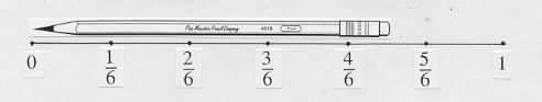 | 3. Place the other types of red bars on the line and write the fractions on the line for these bars. 4. Use this unit line segment to measure the length of a small object, such as a pencil, to the nearest 1/6. Discuss rounding to the nearest fraction on the line. If the length of an object is half way between two division lines, such as 4/6 and 5/6, we usually round up to the fraction for the next division. in the following example, the length of the pencil would be rounded up to 5/6. |
