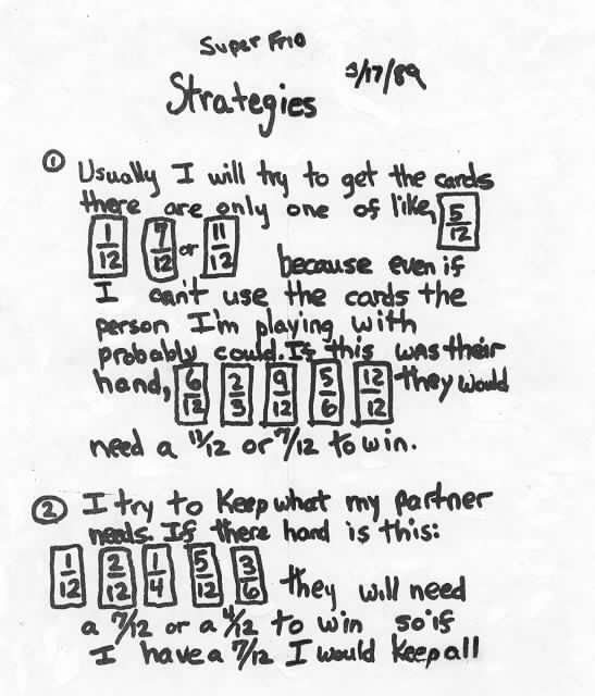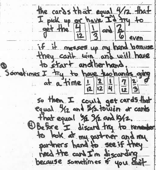 Project the following fifth grade students writing project. It is a good example of the type of reasoning that can be expected from some fifth grade students. Read through some of the highlights of this paper, and the teacher's comments at the end regarding the student's game plan.