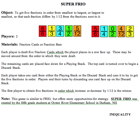 Illustrate Super FRIO by showing the following Fraction Bars. In this game each player is dealt five bars, or five Fraction Playing Cards, which they place in increasing order. Then each player in turn selects an arbitrary bar and replaces one of their five bars, with the goal of obtaining five bars that increase by one part out of 12.