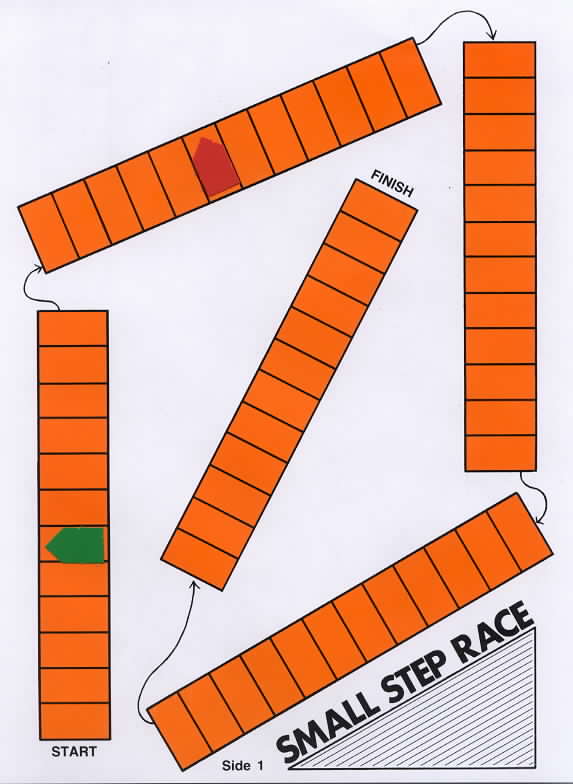 The first game that was developed was Small Step Race. This game mat has five orange bars, each divided into 12 equal parts. During the first visit to the school, the second graders played the game by randomly selecting only orange Fraction Bars. As each orange bar was selected, the amount the student's marker was moved on the race track could be determined by counting the number of shaded parts in the bar or by merely placing the bar on the mat to determine progress. |