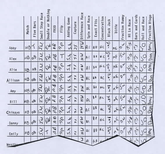 | The teacher introduced the fraction games by showing each game to one or two students. The students were then responsible for teaching the game to their classmates. A grid with the names of the students and games showed who was responsible for each game and which students had played the game. As examples, Emily (EW) was responsible for teaching Double or Nothing as she taught this game to 23 students; and Dan and Amy were responsible for teaching Fraction Bingo. | |||||||||||||||||||||||||||