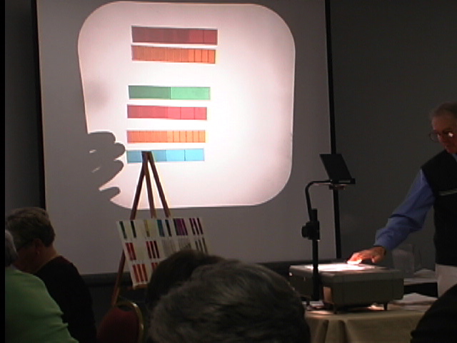 to use the Fraction Bars Transparency Holder for the transparent bars. This can be placed on a tripod or chalk rail near the projector. The following workshop photo shows equality of fractions being illustrated. The Fraction Bars Transparency Holder can be seen in the foreground. |