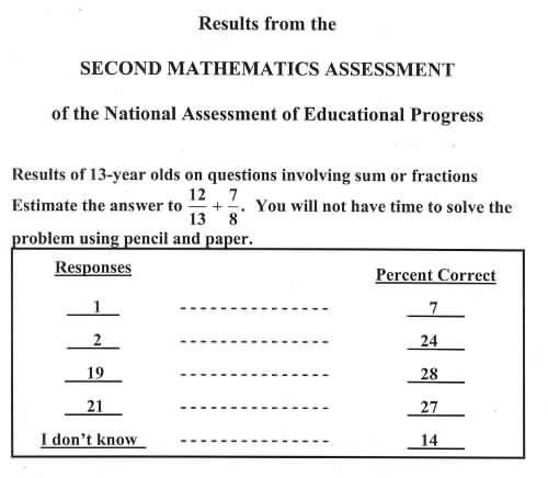 | Project the following NAEP and discuss. In particular, discuss the low performance by students in computing 1/2 + 1/3. Note that this question has been on most NAEP tests with fairly consistent results, and about half of the students who answer this question incorrectly write the sum as 2/5. | ||||||||||||||||||||