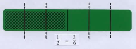 | Splitting each part of a 1/2 bar into three equal parts results in a bar with six equal parts and three shaded parts. So 1/2 = 3/6. |