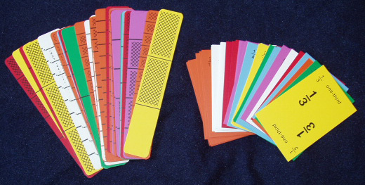 | Bars and Cards is an introductory game to help students make a gradual transition to fraction notation. Layout two bars of each color as shown in the following figure and briefly explain the game of Bars and Cards. The goal is to match a bar to the fraction on the card that has been turned over. | ||||||||||||||||||