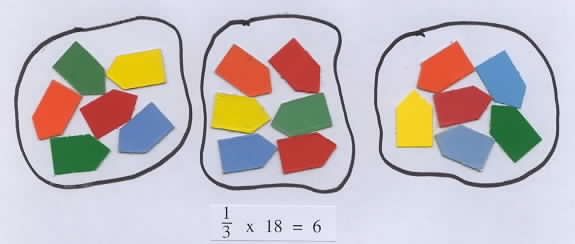 To compute a fraction times a whole number, such as 1/3 x 18, we can think; 1/3 of 18. In this case the first number still tells what to do with the second number, and 1/3 tells us to "divide the clooection into 3 equal parts and take one of them".