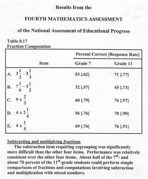 Project the following NAEP result and discuss. Note that products C, D, and E all involve repeated addition and that these products involve convenient numbers. That is, products C and D are whole numbers and product E does not involve simplifying.