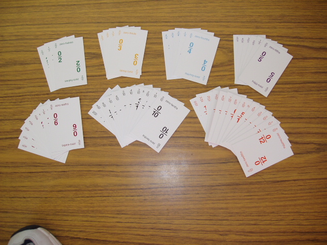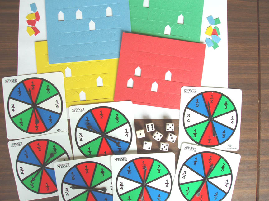 Each of the 49 Fraction Bars Playing Cards is color-coded to correspond to a Fraction Bar and contains a fraction and its name. The colored numeral on the playing card indicates the number of shaded parts and the total number of parts in the corresponding bar and provides for a gradual transition from the Fraction Bars model to the use of fraction symbols. As with the decks of bars, it helps to letter the back of the cards for sorting purposes, one deck with letter A, another with B, etc.