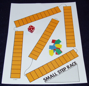 | The student in the following photo has just moved the marker 8 steps on the Small Step mat and is within one whole bar of completing the race. For this bar and a roll of 3 on a die, the student can move 3 x 2/3 = 6/3 = 2 whole bars or 24 steps on the mat. | ||||||||||||||||||