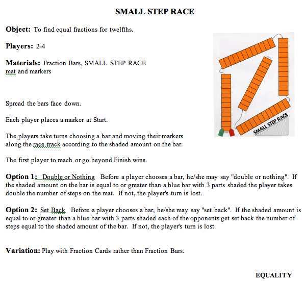 | Materials: Fraction Bars, Small Step mat, markers, and a die per group or pair of players | ||||||||||||||||||