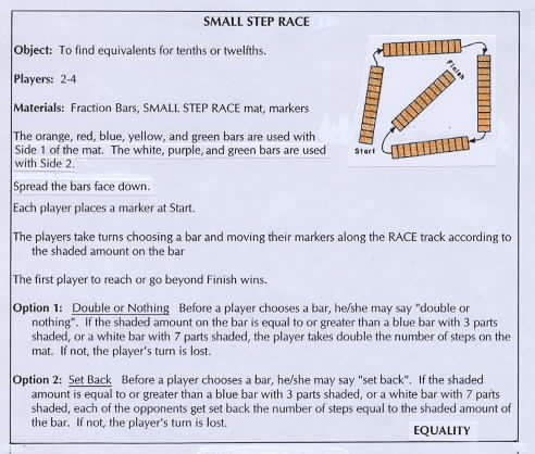 | During my second visit to the school, the students played Small Step Race using both the orange bars and the red bars (6 equal parts per bar). They quickly learned that each shaded part of a red bar equaled 2 steps on the race mat. During subsequent visits, blue, yellow and green bars were introduced: each part of a blue bar equals 3 steps on the mat; each part of a yellow bar equals 4 steps; and each part of a green bar equals 6 steps. This introduction to Fraction Bars was nonthreatening and the students enjoyed the various versions of the game. They grew fond of whole bars (12 steps on the mat) and disliked getting zero bars.