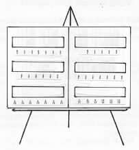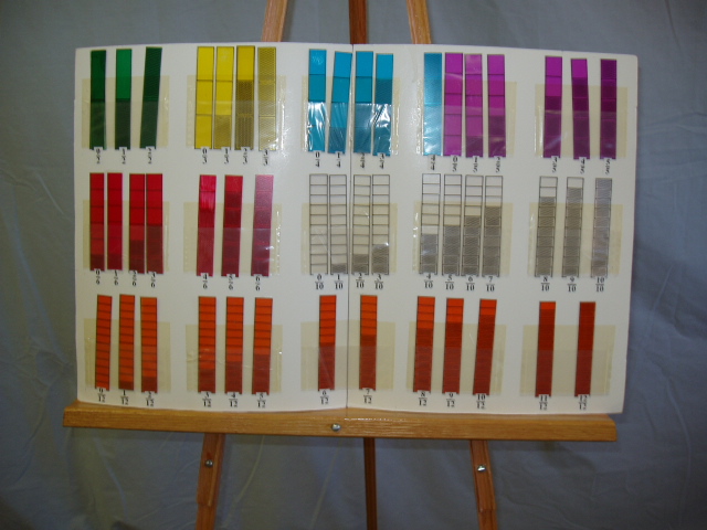 | A Posterboard Holder can be formed to hold the Fraction Bars transparencies by taping six strips of clear transparency onto a 14 x 22 inch posterboard to form pockets as shown at the right. If the posterboard is cut into two 14 x 11 inch halves and taped at the hinge, it can be folded for storage. The fraction for each bar can be typed on gum labels and attached below the pockets as shown. The resulting display can be placed on a chalk rail or tripod as shown below. | |||||||||||
