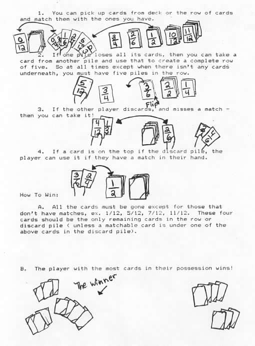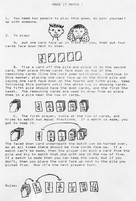 Today our lesson was on equality of fractions and I was surprised to learn that . . . One thing that I don't understand about fractions is . . . Fractions are like "broken numbers" because . . . Teaching Parents Games After the students have played one or more Fraction Bars games, an interesting assignment is to have them teach their parents and write about the results in their journals. I happened to be in Mr. Schiot's fifth grade class one day when the students were describing this experience. They were quite anxious to relate what happened and the results were interesting and at times very funny. Student Papers: Many of the Fraction Bars games have strategies which the students discover and which can become a source for writing (see Super FRIO Strategies). Another source for writing comes from student descriptions of Fraction Bars games which they have revised or games they have created. To guide his students in writing a major paper, Mr. Schiot encouraged his students to use the following outline: (1) Experiences; (2) Topic choices; (3) Talking; (4) Thinking; (5) Research; (6) First draft; (7) Read to a friend; (8) Conference; (9) Revise and polish; (10) Rewrite; (11) Proofread; (12) Illustrate; (13) Publish; and (14) Share. The following paper describes a game that was created by Kelly, one of Mr. Schiot's students. . |